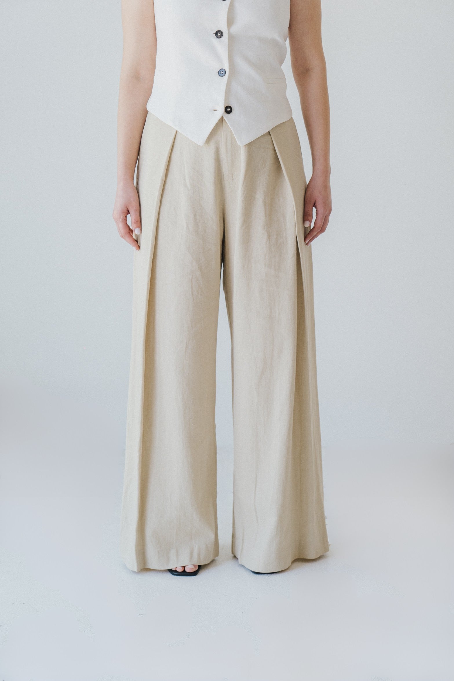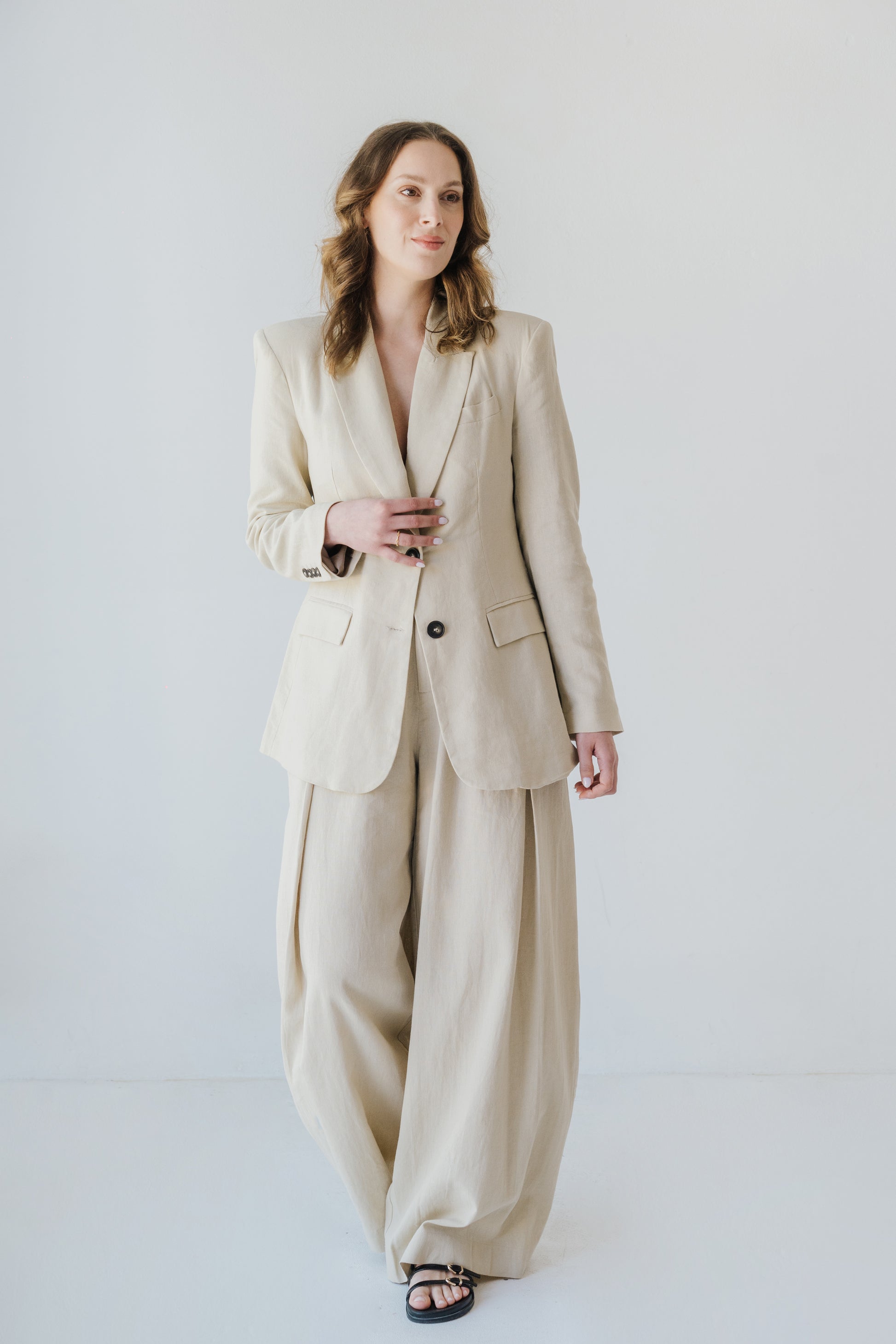 A calça foi pensada para cair de forma fluida, sem marcar a zona da anca. O tecido em linho com viscose ajuda a criar movimento natural, evitando aquele efeito rígido que algumas peças em linho têm. As pregas frontais também contribuem para um caimento mais elegante e solto.